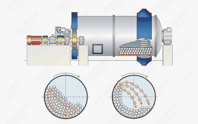 物料由進(jìn)料裝置經(jīng)入料中空軸螺旋均勻地進(jìn)入球磨機(jī)第一倉,該倉內(nèi)有階梯襯板或波紋襯板,內(nèi)裝不同規(guī)格鋼球,筒體轉(zhuǎn)動產(chǎn)生離心力將鋼球帶到一定高度后落下,對物料產(chǎn)生重?fù)艉脱心プ饔?。物料在第一倉達(dá)到粗磨后,經(jīng)單層隔倉板進(jìn)入第二倉,該倉內(nèi)鑲有平襯板,內(nèi)有鋼球,將物料進(jìn)一步研磨。粉狀物通過卸料箅板排出,完成粉磨作業(yè)。
